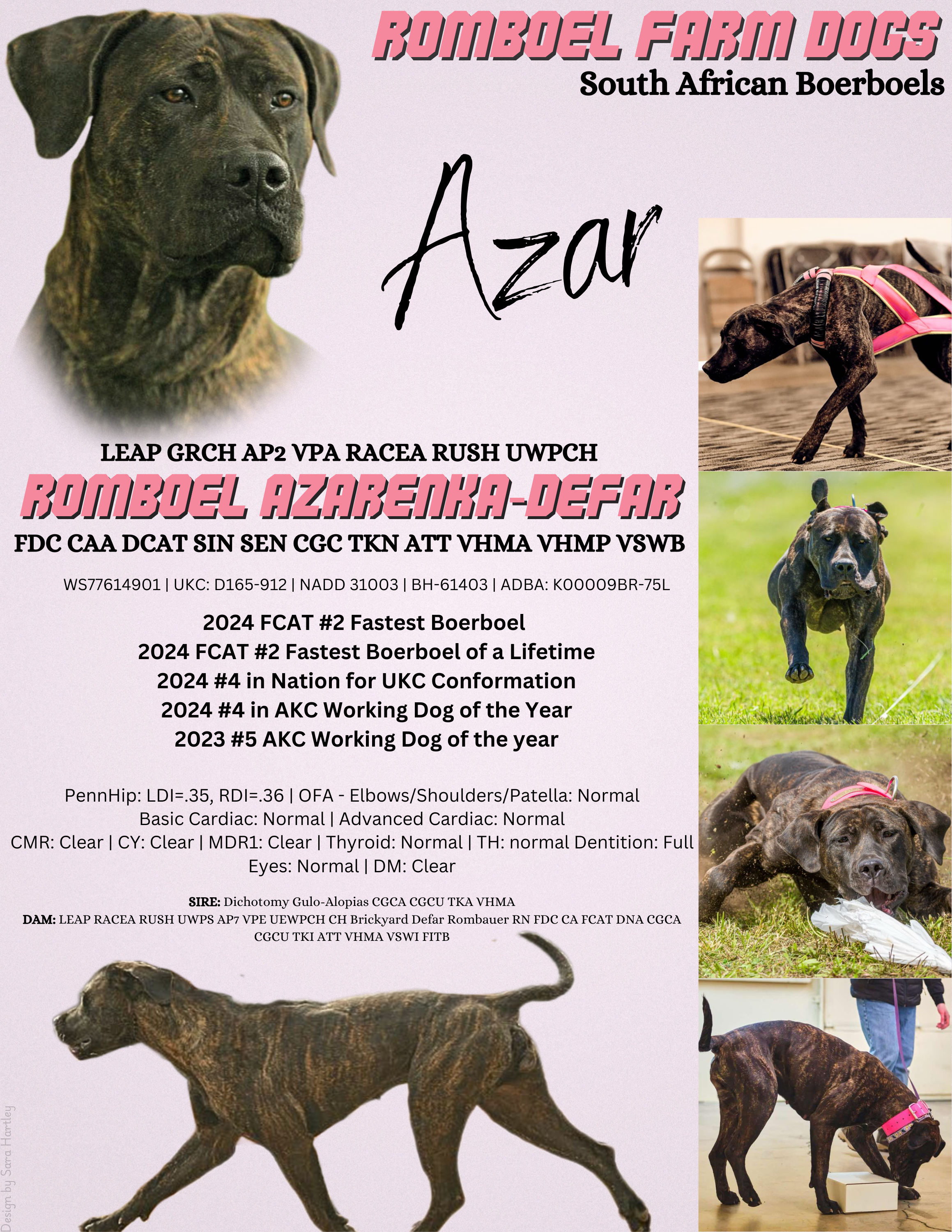2024 2nd Fastest Boerboel for AKC FCAT, 2nd Fastest Boerboel of a Lifetime for AKC Fast Cat, #4 in Nation for UKC Conformation, #4 in AKC ABC working Dog of the Year Award
